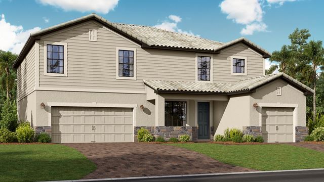 On the first floor of this two-story home is a living room, formal dining room, open living space with a kitchen, bedroom suite and an attached lanai for outdoor activities. Upstairs hosts the owners suite, three secondary bedrooms and a cozy loft overlooking the Great Room.