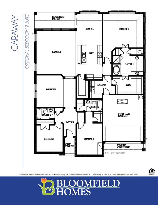 A one-story home featuring 3 bedrooms, 2.5 baths, and a dining area. Other configurations include a media room or 4th bedroom option in lieu of the dining room and a study or guest suite option at bedroom 2.