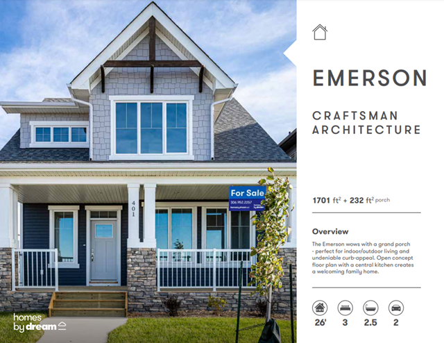The Emerson wows with a grand porch - perfect for indoor/outdoor living and undeniable curb-appeal. Open concept floor plan with a central kitchen creates a welcoming family home. Home Features Vaulted owner's suite ceiling options 232 sqft covered porch Convenient rear mud room Functional walk-in pantry Main floor laundry 5-piece ensuite Winged bedroom design for added privacy Source: Homes by Dream