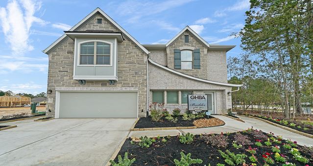 Plan #7033 | Two-story | 3 bedrooms | 2.5 baths | flex room | 2-car attached garage | Mid-level foyer with window nook opens to split stairway. Second floor has large family room open to breakfast area and island kitchen overlooking covered balcony. Spacious main suite with private bath, features separate corner tub and shower with seat, and large walk-in closet. Utility room and half bath conveniently located. Large first floor flex room leads to covered patio. Secondary bedrooms have walk-in closets. Full bath and under stair storage located near garage entry. **Photos are representative, selections & features may vary with community**