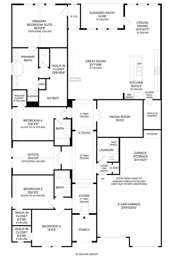 The Indio s distinctive extended foyer hallway with tray ceilings flows into the expansive great room and views to the desirable covered patio beyond. The beautifully designed kitchen features an oversized center island with breakfast bar, large walk-in pantry, and ample counter and cabinet space. The casual dining area opens to the spacious covered patio and rear yard. A cathedral ceiling and palatial walk-in closet adorn the magnificent primary bedroom suite along with a splendid primary bath with dual vanities, a large soaking tub, luxe shower, linen storage, and private water closet. Three additional bedrooms, one with private bath and two with shared hall bath, all feature sizable closets. Additional highlights include a generously sized office with cathedral ceiling, large media room, convenient everyday entry off the garage, centrally located laundry, and ...
