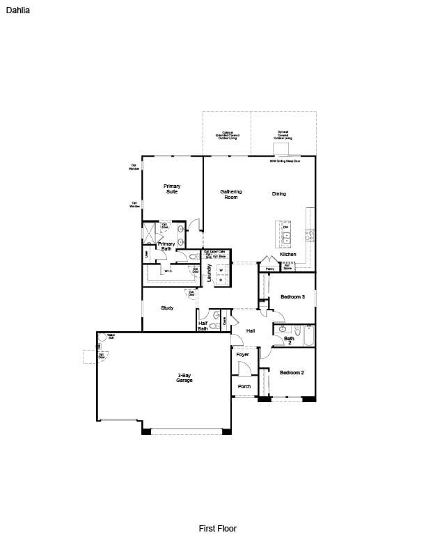 The Dahlia floor plan blooms with possibilities! Head through the porch, into the foyer, and through the hallway to find beautiful open-concept living. A spacious great room opens to a casual dining area and a modern kitchen outfitted with an island and pantry. Tucked away is a luxurious primary suite, a primary bathroom with dual vanities, and a roomy walk-in closet. Make your way back towards the front of the home to discover a two-car garage on one side of the hall, two bedrooms, and one bathroom on the other. Choose an exterior you love and stand out in the Dahlia! *Floorplans are preliminary and subject to change without notice.