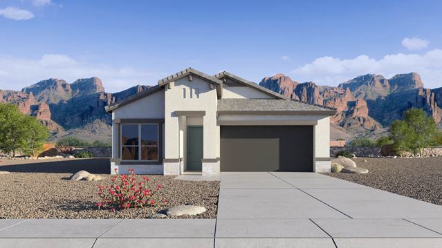 Introducing the Dove floor plan, thoughtfully designed to maximize space and functionality. This home features a tandem garage, providing ample room for storage or an additional vehicle. The corner kitchen offers convenience and style, while the large great room overlooks the backyard, creating a perfect space for relaxation and entertainment. Retreat to the first bedroom, where comfort meets luxury with a full bathroom and a walk-in closet, offering a peaceful sanctuary to unwind after a long day. But what truly sets the Dove apart are its modern amenities. From Smart Home Technology to granite countertops and 20x20 tile flooring, every detail is carefully chosen to enhance your lifestyle and elevate your home experience. With upgraded carpet featuring stain guard and desert front yard landscaping, the Dove offers the perfect blend of comfort and sophist...