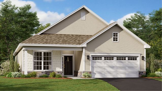 A generous open floorplan on the first level of this new home is shared among the family room, kitchen and dining room, with sliding glass doors that lead outside, conveniently laid out for the active adult homebuyer. The owners suite is tucked toward the back for privacy, while another bedroom is located right off the foyer. A versatile den with a walk-in closet completes the first floor. An attic is found upstairs.