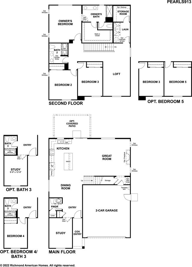 The Pearl floor plan opens with a powder room and a private study-personalize by optioning these as a third bathroom and a fourth bedroom instead. At the back of the home, you'll find a dining area, a great room with an optional fireplace, and a kitchen with a center island and access to the covered patio. Upstairs, the owner's suite includes a walk-in closet and an attached bathroom. The second floor also features a laundry, two bedrooms and a bathroom, in addition to a loft that can be optioned as fifth bedroom.