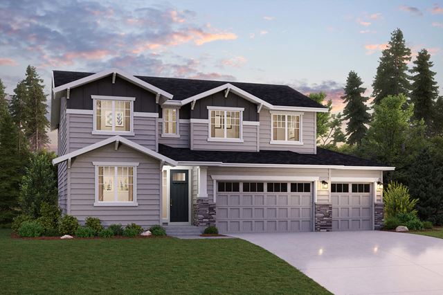 The main floor of the striking Vaughn plan is anchored by an expansive open-concept dining and great room area-flanking an inviting covered patio at the back corner of the home. Overlooking all of it, a lavish kitchen boasts a large center island and a convenient corner pantry. Toward the front of the home, you'll also find a private study, which may also be available as a downstairs bedroom. A versatile bonus room can be found upstairs, plus a full hall bath, three secondary bedrooms, and a sprawling primary suite with a roomy walk-in closet and an attached bath-featuring dual vanities and a separate tub and shower.