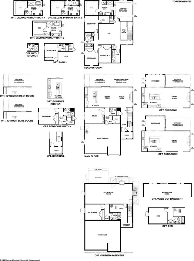 The Yorktown's main floor offers an expansive entertaining space at the back of the home: the great room with optional fireplace, dining room overlooking the backyard, and the kitchen with a large center island. The 3-car garage leads to a convenient mudroom with walk-in closet and optional keydrop, a powder room and a private study. On the second floor, there's an immense loft surrounded by three bedrooms, a shared bath, a laundry room and an primary suite with its own bath and spacious walk-in closet. Options include a sunroom, covered patio, finished basement, bonus bedrooms and deluxe bath.